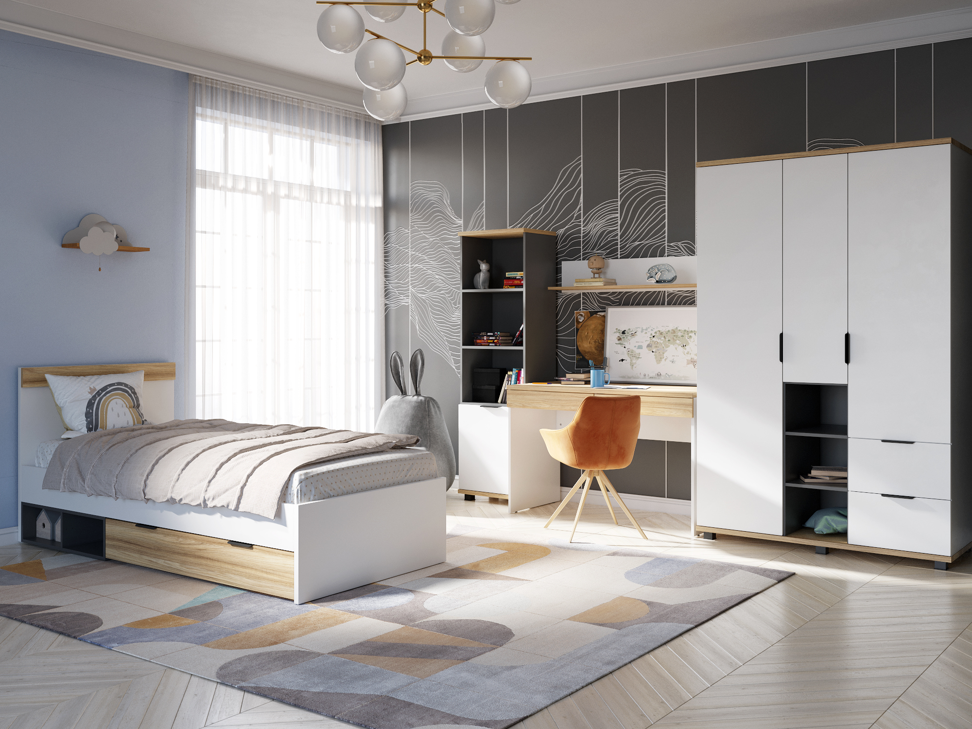 Кровать и стол — в спокойной гамме, а шкаф и стеллаж добавляют динамики.