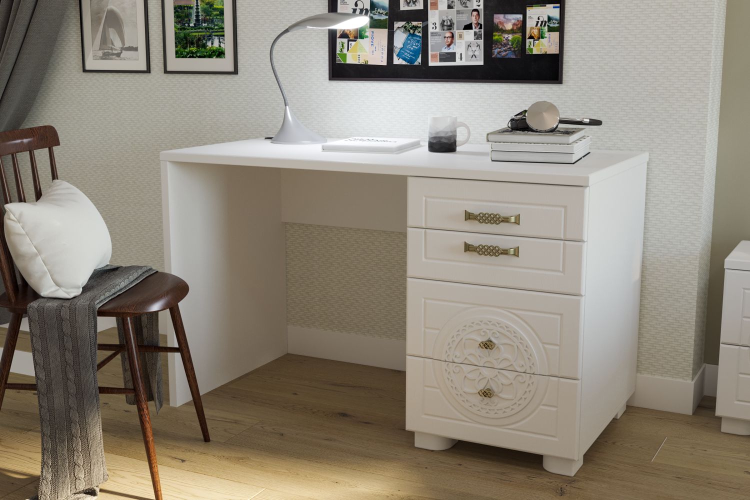 Письменный стол Монблан МБ-70К поможет создать достаточно комфортное рабочее место. Широкая и удобная столешница позволит разместить на столе стопку документов, канцелярские принадлежности, фотографии и вазу с красивыми цветами. Четыре выдвижных ящика созданы для хранения более ценных и важных предметов. Расположение ящиков только с правой стороны. Толщина столешницы: МДФ 25 мм, левая боковина выполнена из ЛДСП 25мм. Фурнитура: телескопическими направляющими полного выдвижения без доводчиков, ручки бронза, опоры пластик. Высота опоры 50 мм.