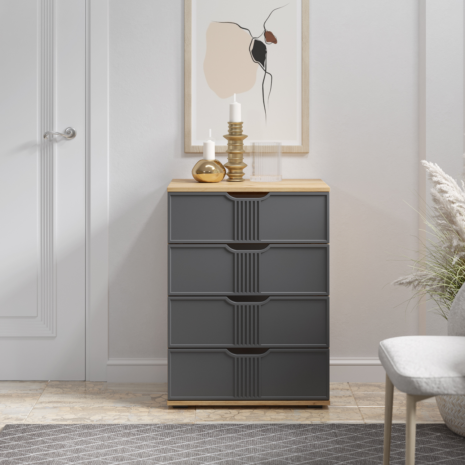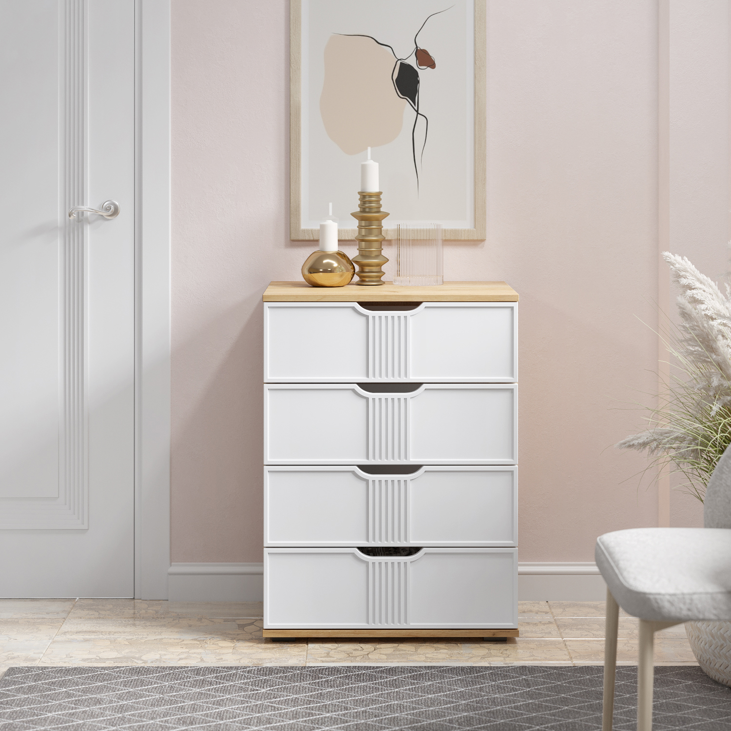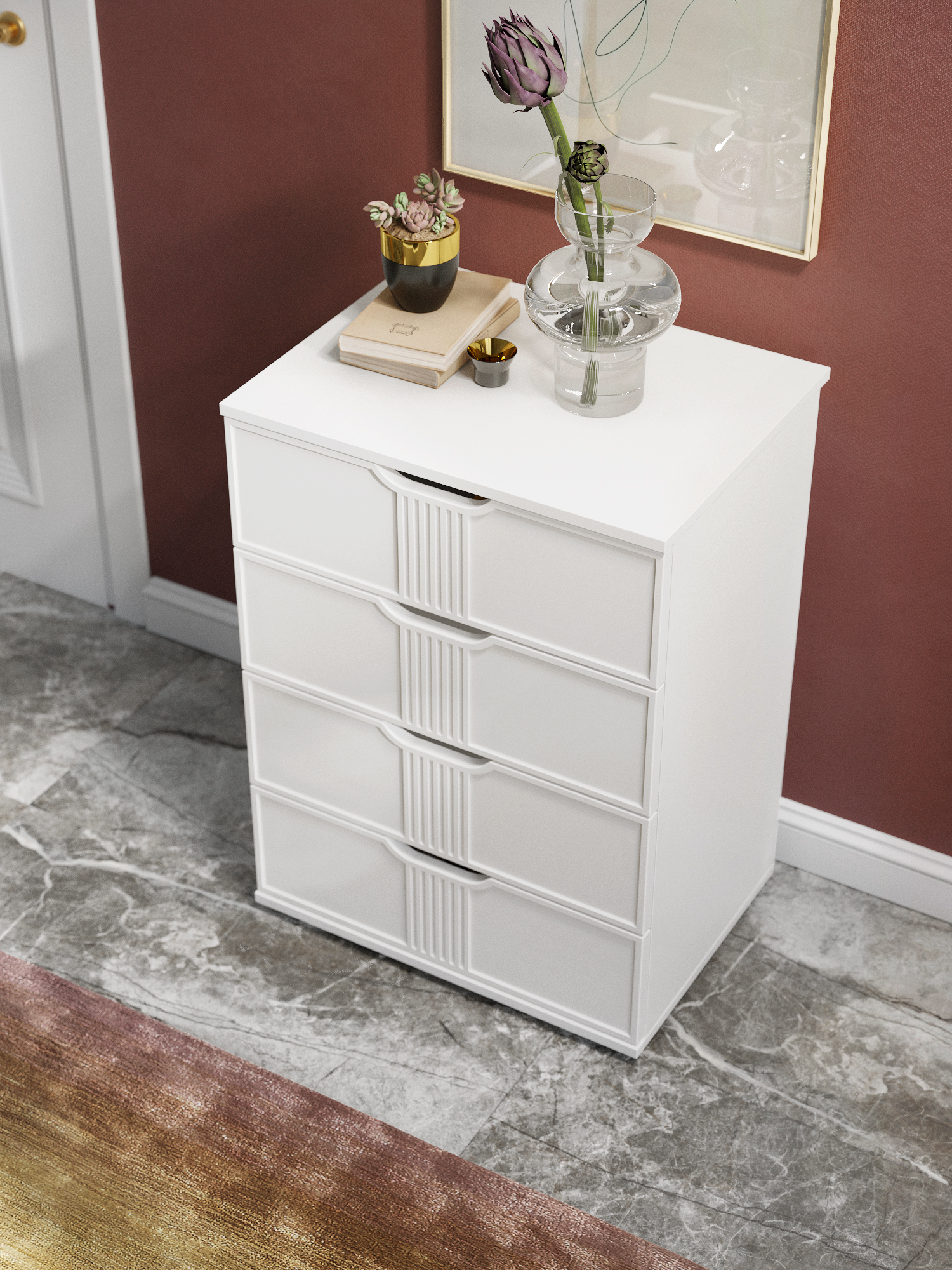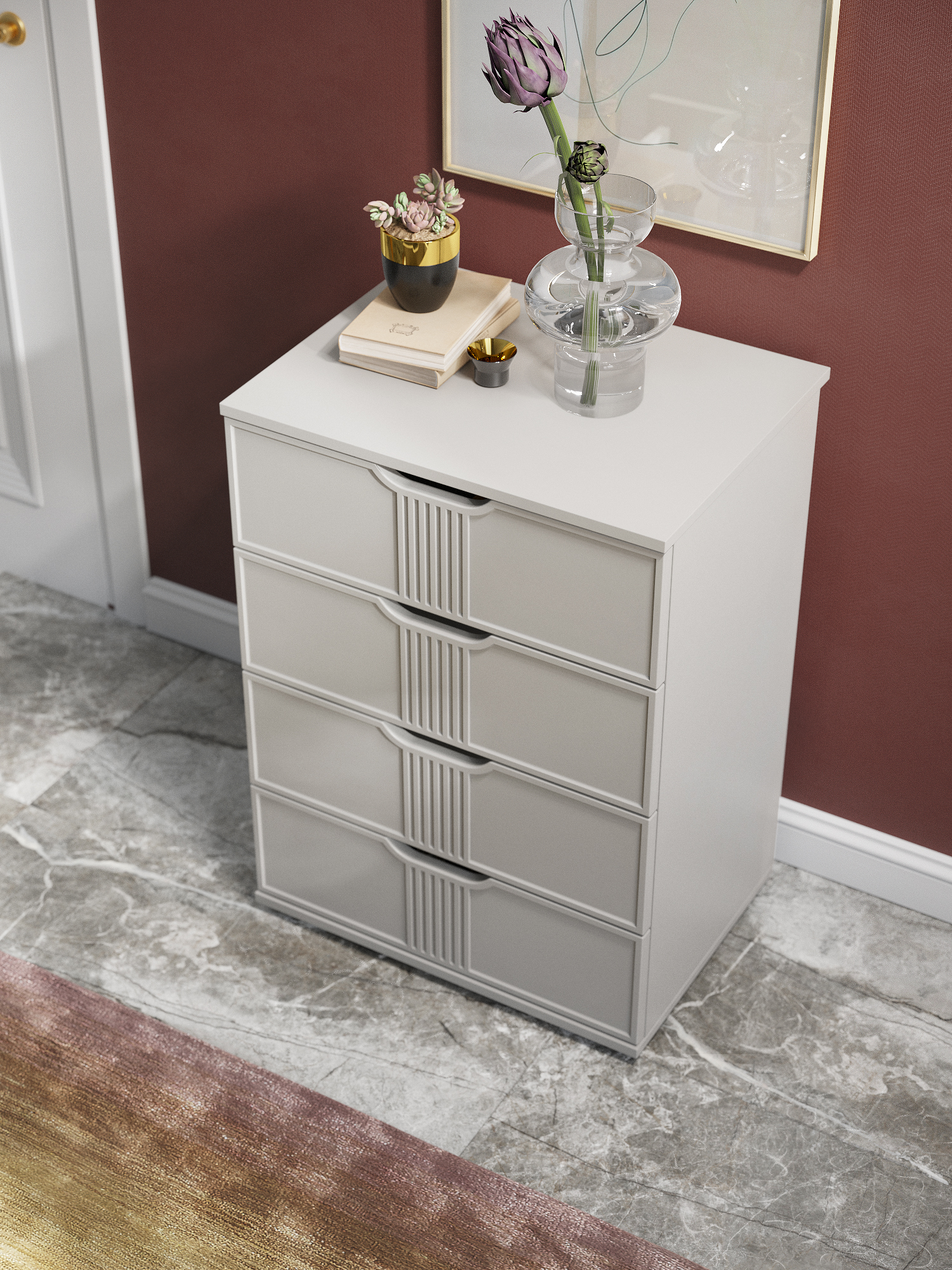Комод Эмилия ЭЛ-19 идеально впишется в современный интерьер гостиной, спальни или прихожей. Комод изготовлен из ЛДСП 16 мм, фасады МДФ. Свес крышки в 30 мм обеспечит прилегание к стене с любым плинтусом. Высота опоры 20 мм. Внутренние размеры ящика ш506х г334х в110 мм. Фурнитура: телескопические направляющие полного выдвижения без доводчиков, регулируемые опоры.