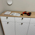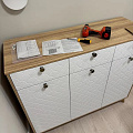 Тумба / комод Велламо ВО-05 станет функциональным и стильным дополнением гостиной комнаты или спальни. Комод визуально поделен на три секции с выдвижными ящиками и распашными дверцами. Стильные и необычные МДФ фасады с фрезеровкой и металлическими ручками. Дно ящика двп 3 мм. Высота опоры из массива дерева 120 мм. Фурнитура: телескопические направляющие полного выдвижения без доводчиков, ручки металл, опоры деревянные.