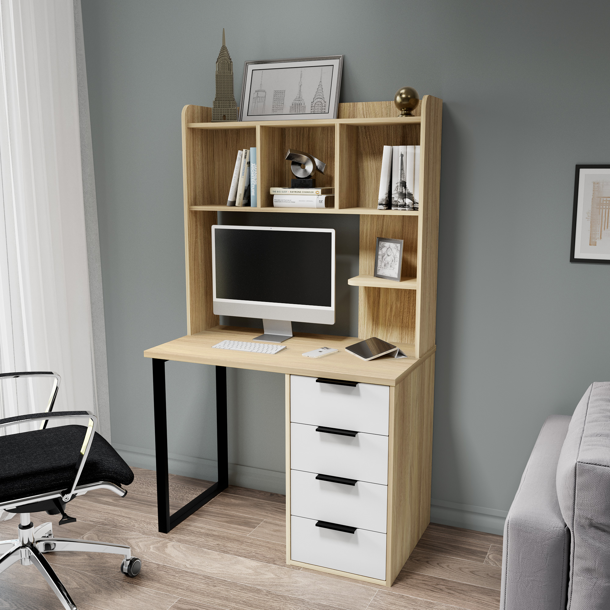 Стол письменный, компьютерный С-404 с полкой П-100 позволит создать комфортное и стильное рабочее пространство в офисе или домашнем кабинете. Стол имеет прочную стальную опору и тумбу с четырьмя выдвижными ящиками. Столешница изготовлена из ЛДСП 25 мм, фасады МДФ 16 мм. Дно ящика двп 3 мм. Стол и полка могут быть собраны в зеркальном варианте. Фурнитура: телескопические направляющие полного выдвижения без доводчиков, ручки и опора металл.