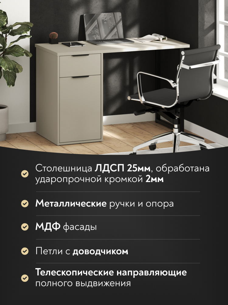 - Столешница: изготовлена из ЛДСП 25 мм, что обеспечивает устойчивость к нагрузкам и долговечность.