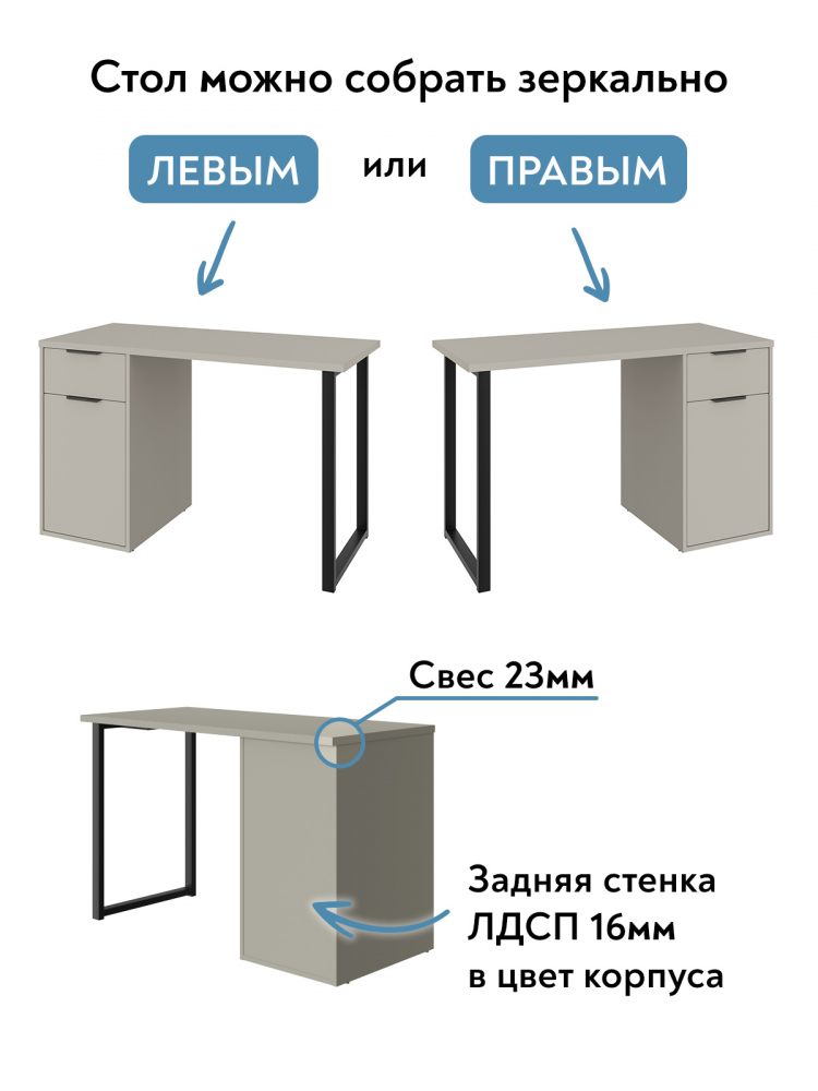- Зеркальная сборка: возможность собрать стол в «правом» или «левом» варианте для удобства размещения в любом помещении.