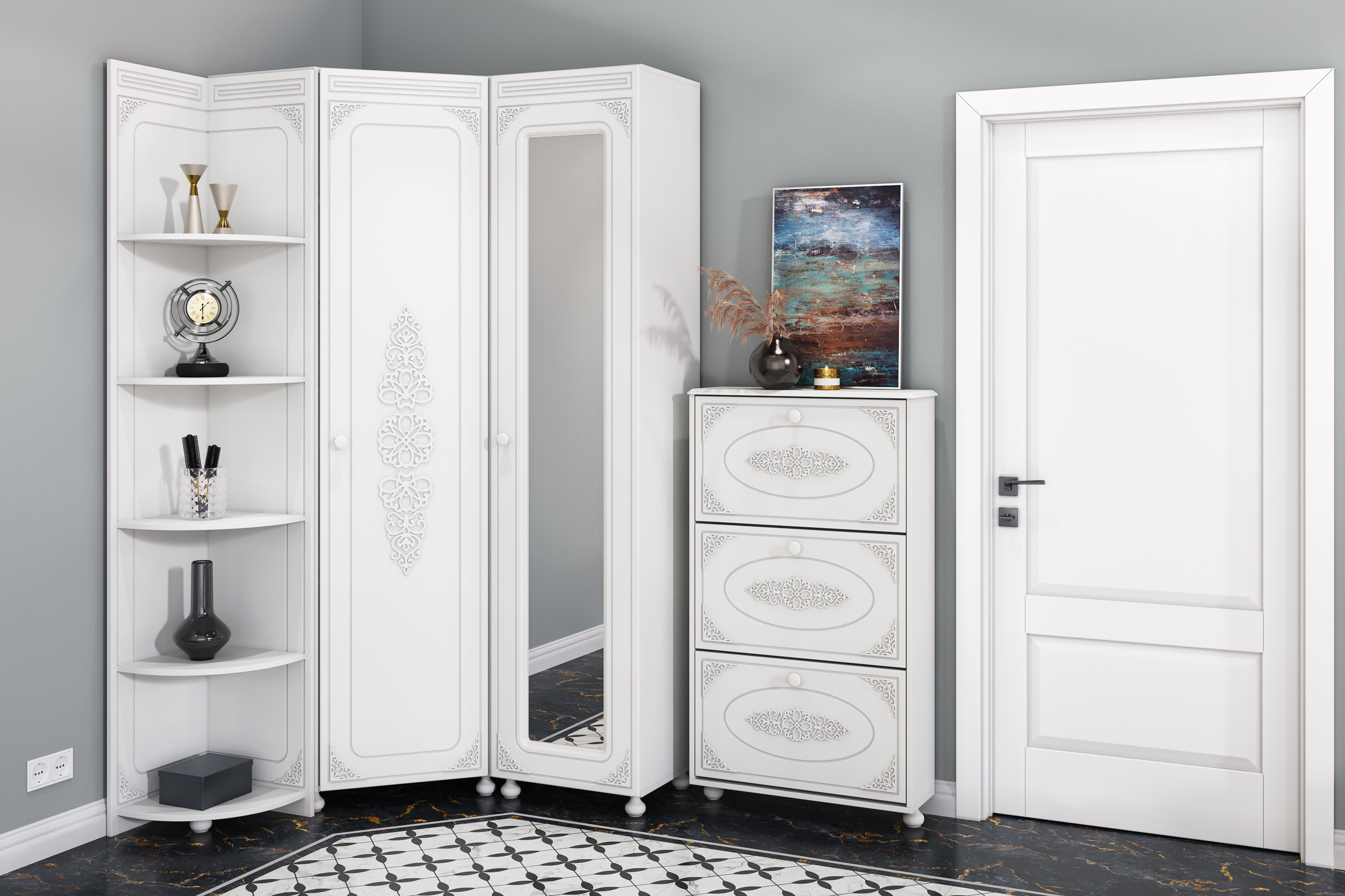 <ul> <li>Размеры гарнитура (в/г) в мм: 2160х416</li> <li>Цвет корпуса/фасада: белый структурный/белое дерево</li> <li>Материал корпуса/фасада: ЛДСП, МДФ</li> </ul> <p> <br> </p> <p> Комплект данного гарнитура: </p> <ul> <li>Тумба для обуви (обувница) Ассоль АС-46 белое дерево / 1 шт</li> <li>Шкаф угловой Ассоль АС-52K (правый) белое дерево / 1 шт</li> <li>Шкаф Ассоль АС-532К с зеркалом (правый) белое дерево / 1 шт</li> <li>Стеллаж угловой Ассоль АС-54 белое дерево / 1 шт</li> </ul> <p> <b>Важная информация.</b> Мебель доставляется в разобранном виде, в упаковках. </p>Описание