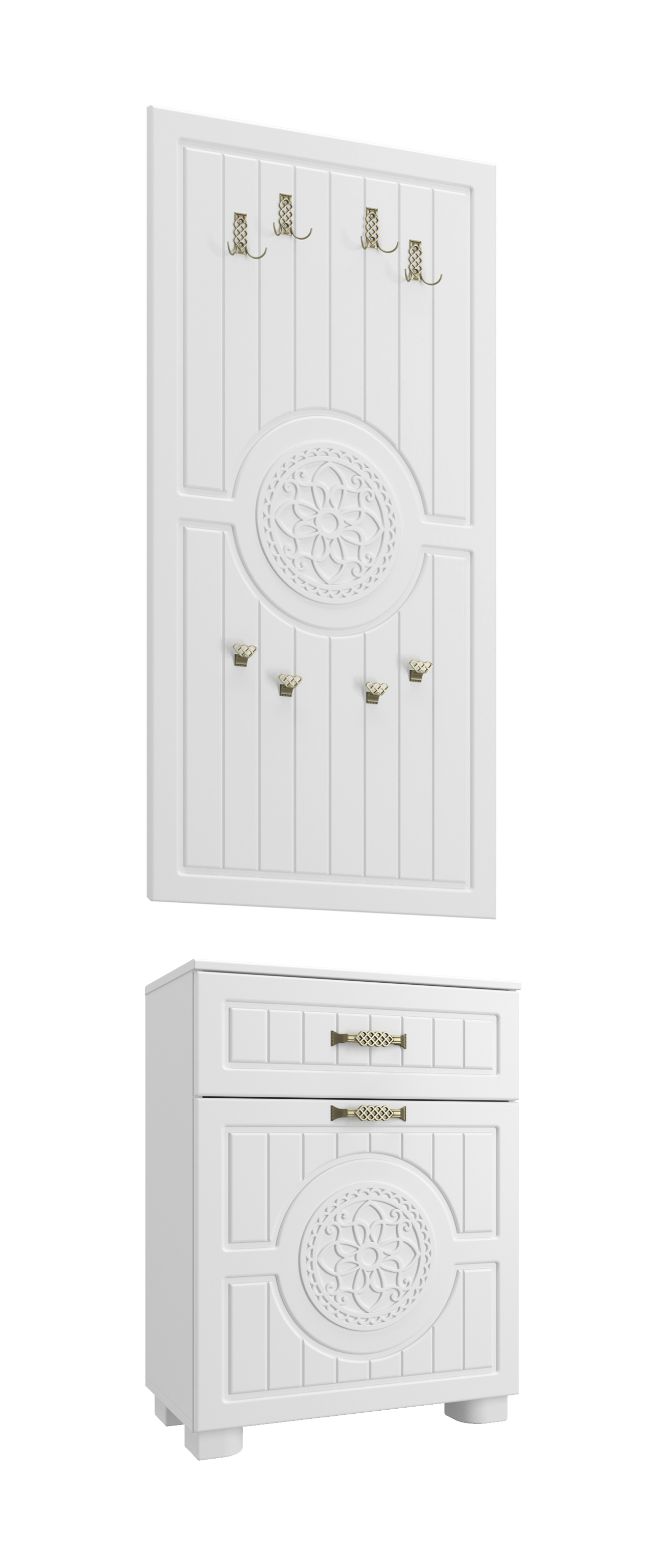 Комплект прекрасно впишется в интерьер современной прихожей. Вешалка может быть установленна на любой высоте. Высота опоры 50 мм. Фурнитура: ручки и крючки металл, телескопические направляющие полного выдвижения без доводчиков, газлифты.