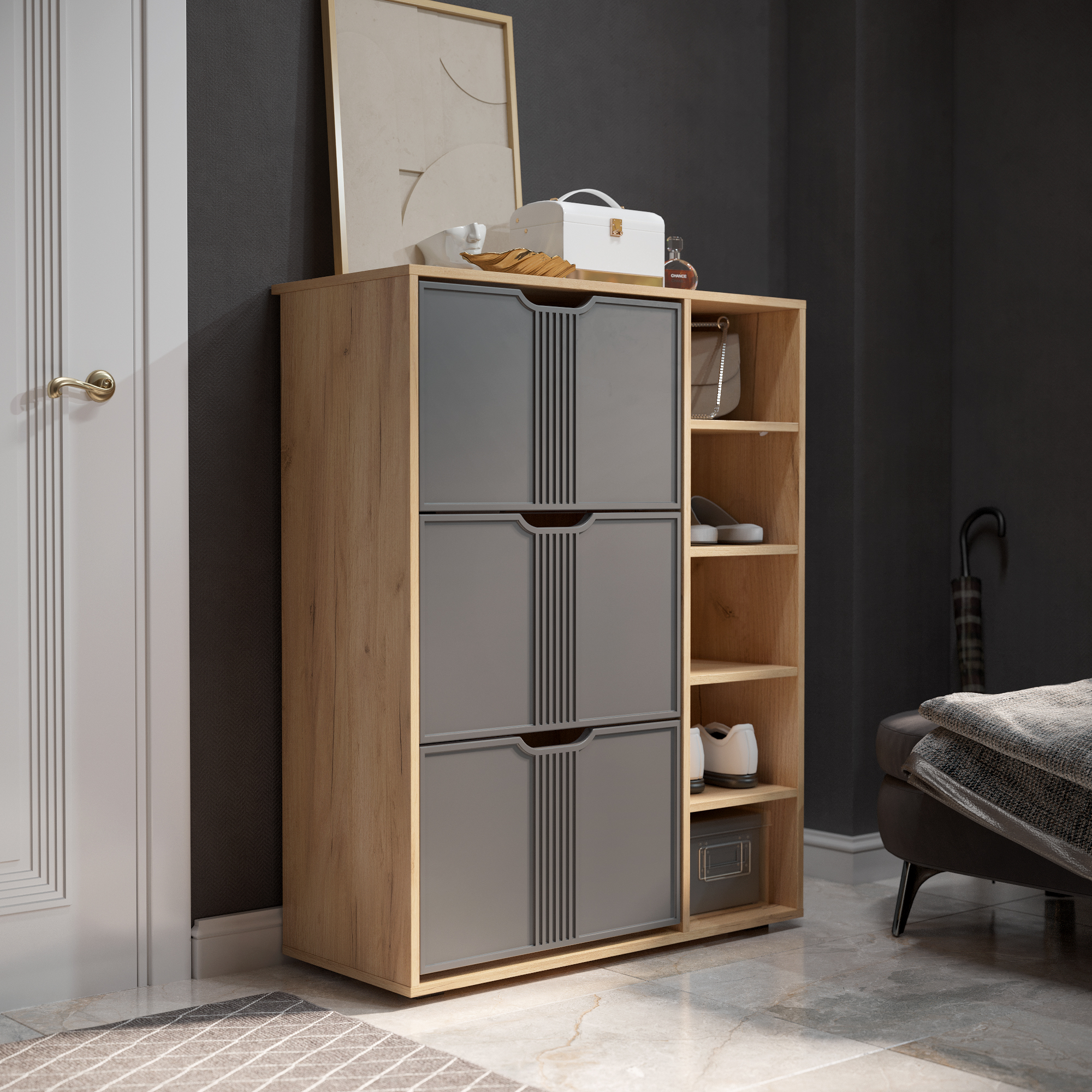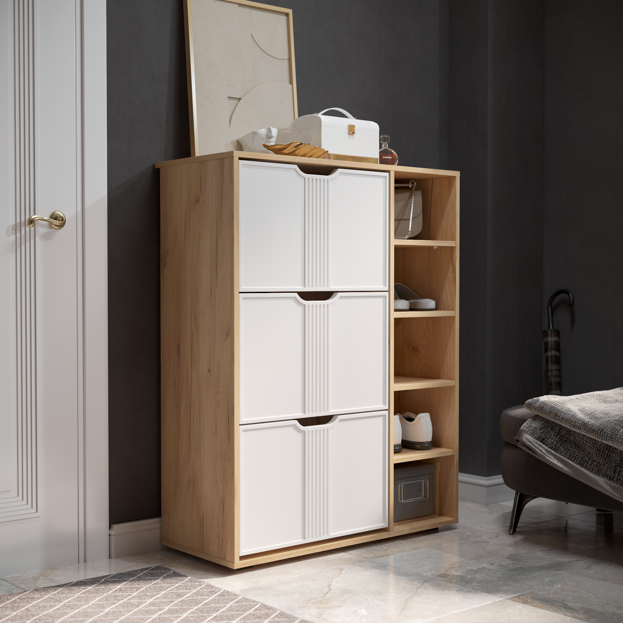 Тумба для обуви Эмилия ЭЛ-42 поможет создать уютную атмосферу в вашей прихожей. Изделие навсегда решит проблему разбросанной обуви по всему коридору. Тумба оснащена четырьмя полками и отделениями со специальными отсеками для хранения обуви. Свес крышки в 30 мм обеспечит прилегание к стене с любым плинтусом. Высота опоры 20 мм.
