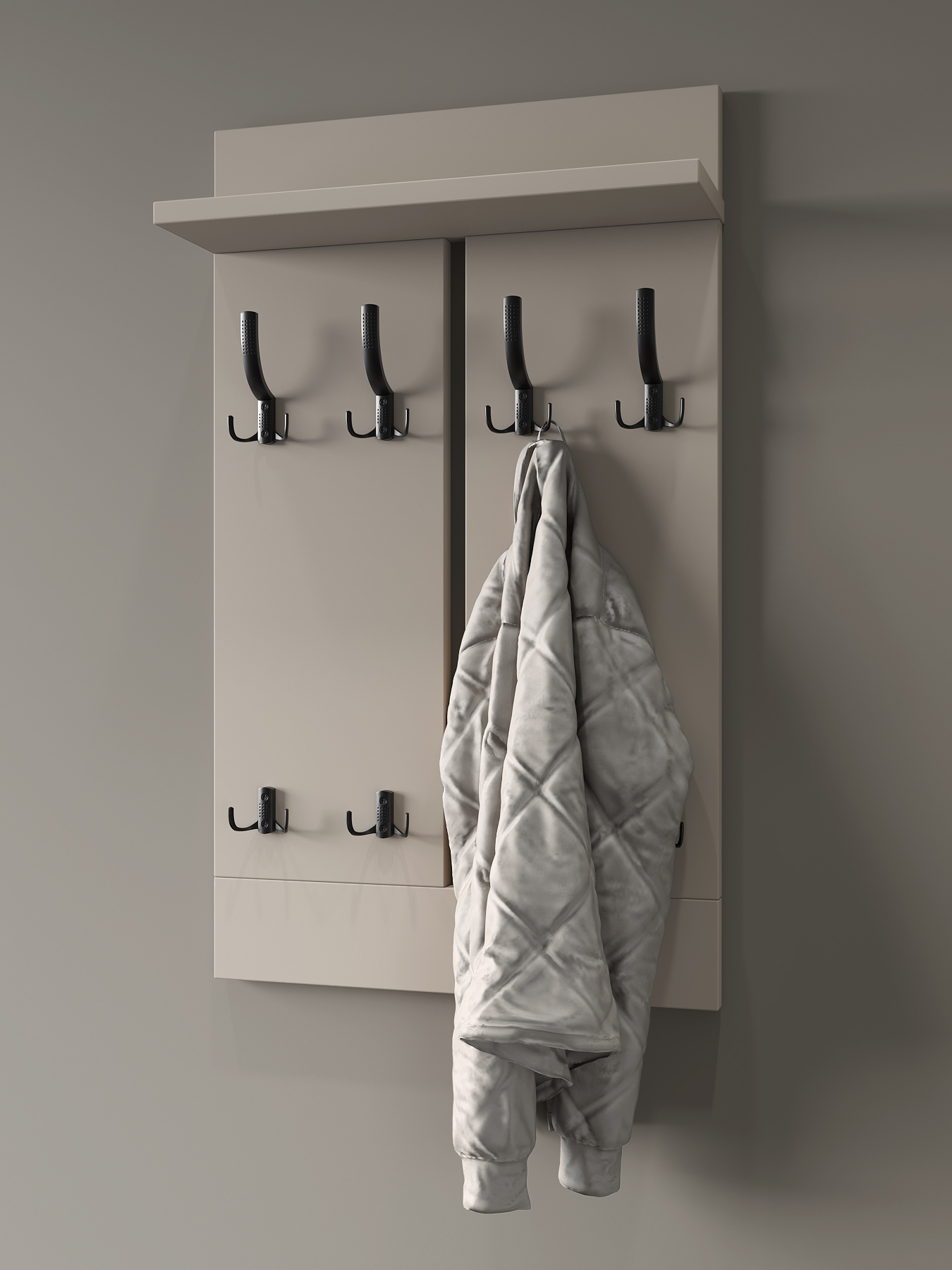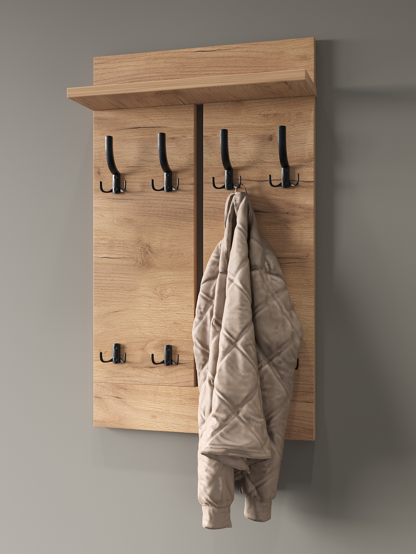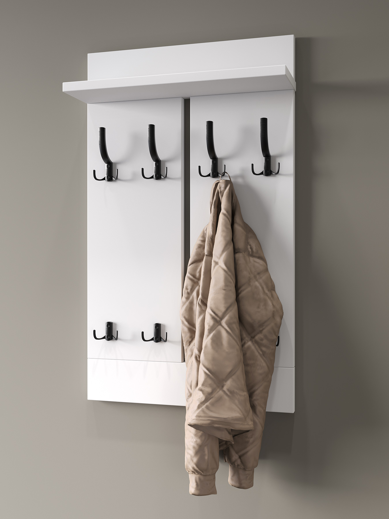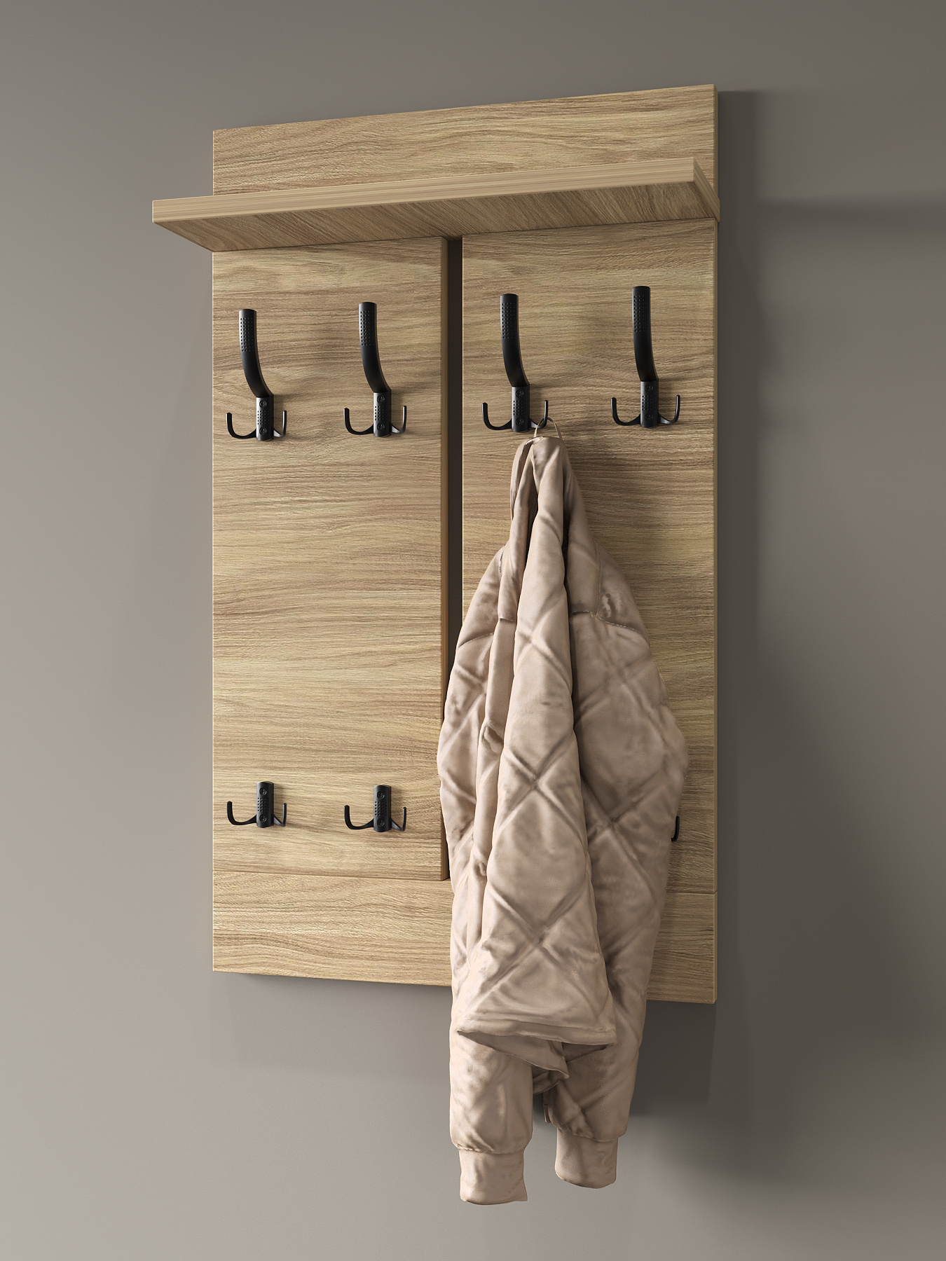 Вешалка ВН-13 компактна и функциональна, поэтому органично дополнит любой интерьер вашей прихожей. Вешалка состоит из нескольких объединенных панелей лдсп, четырех двойных и тройных крючков, благодаря чему на ней можно с легкостью разместить верхнюю одежду нескольких человек. Крючки металлические, максимальная допустимая нагрузка до 15 кг на один крючок.
