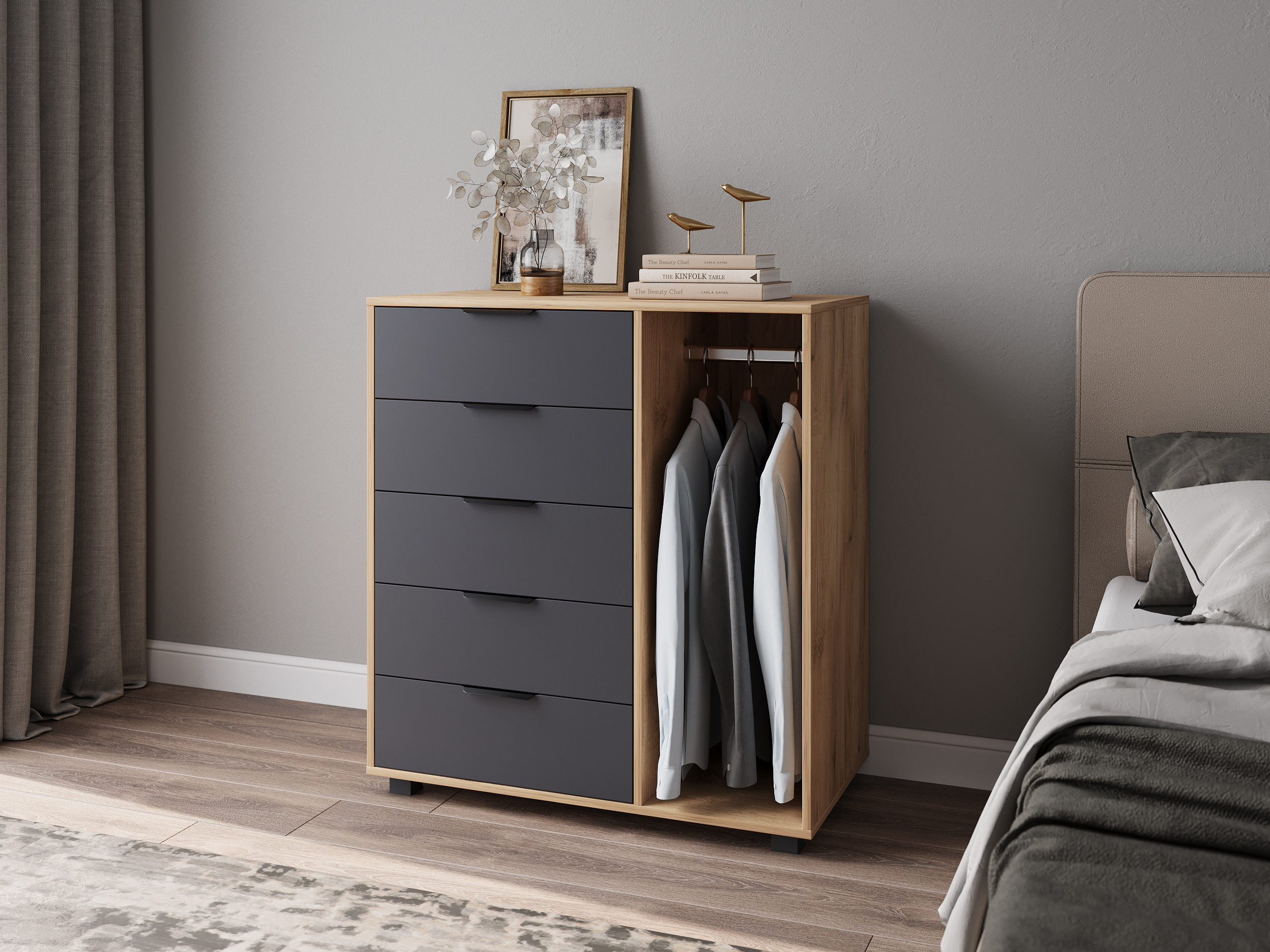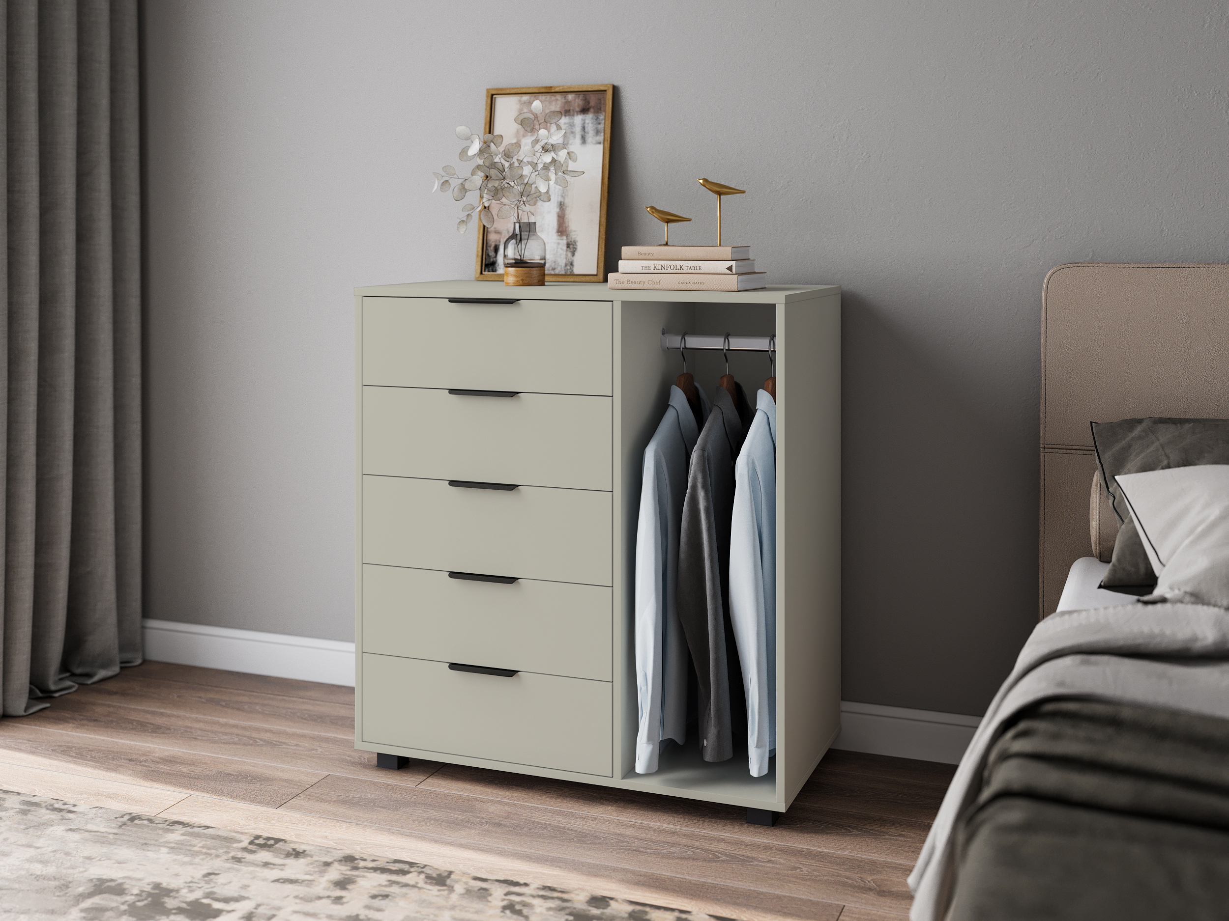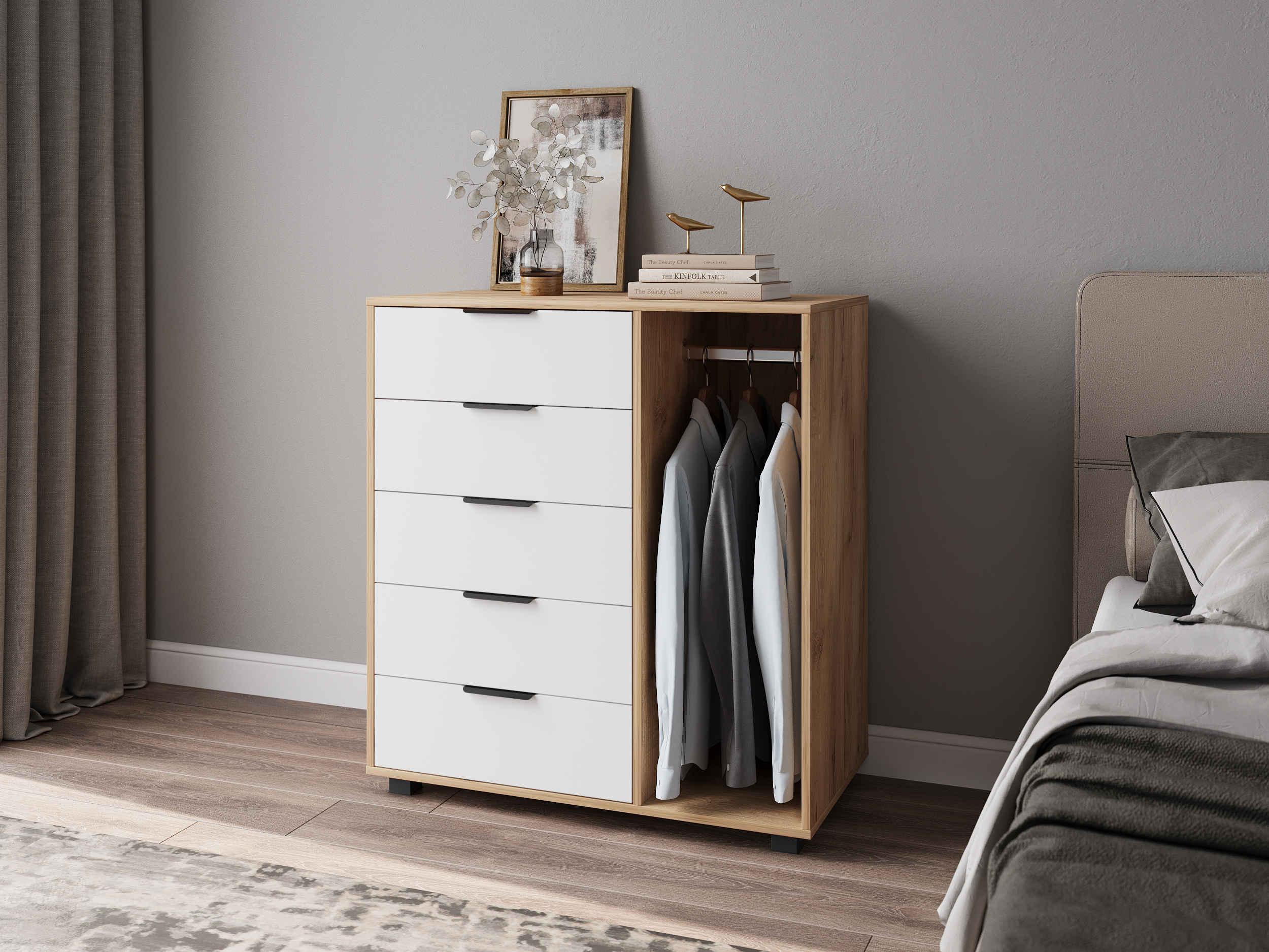 Комод/шкаф комбинированный К-20 отлично дополнит место для хранения в спальне и гостиной. Комод оснащен 5-ю выдвижными ящиками и штангой для пиджаков и рубашек.