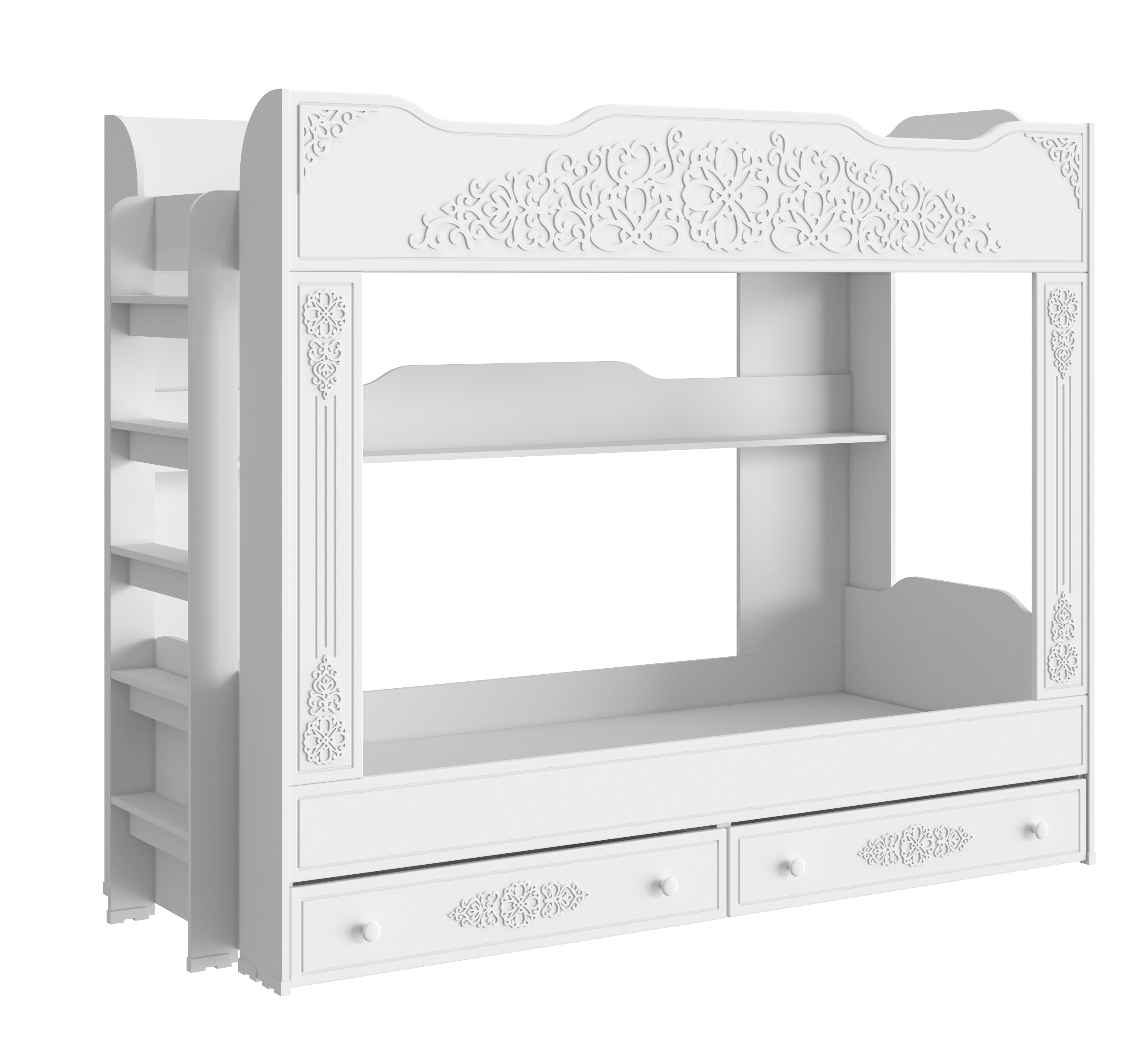 Кровать двухъярусная Ассоль плюс АС-25 превосходит по внешнему виду все обычные двухъярусные кровати. Поможет сэкономить пространство и подарит много новых возможностей своим обитателям. Практичная, надёжная и безопасная она станет не только местом для сна, а ещё и укромным уголком для чтения, отдыха и развлечений! Коллекция Ассоль плюс эксклюзивна по своему дизайну. Интересный узор, белый цвет станут мечтой ваших детей. Лестница собирается на любую сторону (переставляется изголовье). Высота изголовья верхней кровати 398 мм, защитных бортов 348 мм. Высота защитных бортов нижней кровати 186 мм. Высота лестницы 1542 мм, ширина ступеней 98 мм, ширина лестницы 428 мм. Ступени имеют дополнительное ребро жесткости. Основание кровати: настил из ЛДСП. Рекомендуемый размер матраса в мм: 900х2000х100-130. Опоры кровати имеют подпятники, предотвращающие повреждение напольного покрытия. В оформлении фасадов МДФ применяется уникальная технология нанесения объемного узора 3D