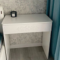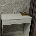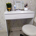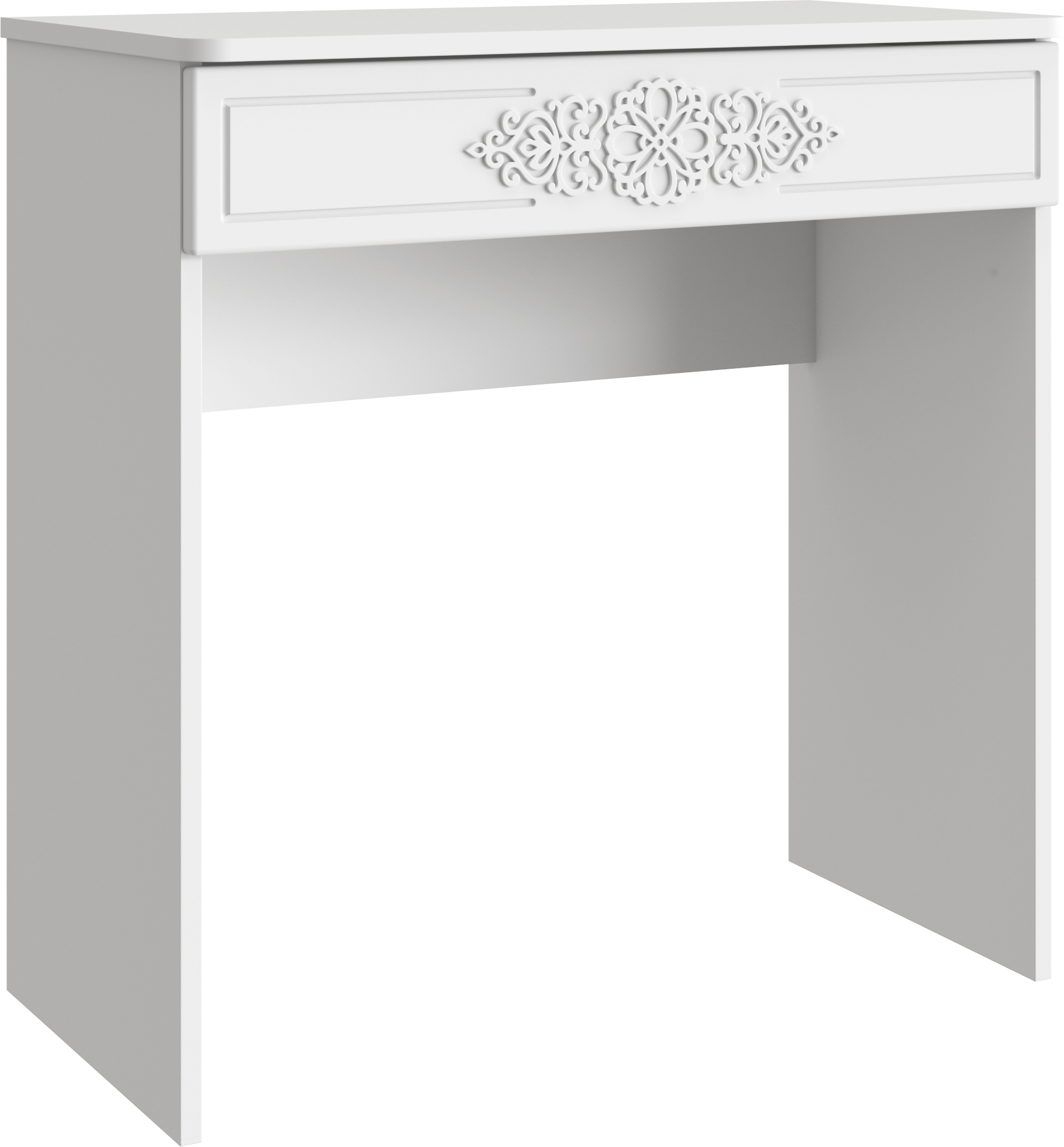Туалетный столик ТС-15 - неотъемлемая часть спальни или женской комнаты. Каждая девочка, девушка или дама хочет иметь собственное пространство, свой уголок красоты, для того чтобы привести себя в порядок, нанести макияж, удобно и компактно расставить свою косметику и парфюмерию, аккуратно сложить украшения и аксессуары. Столик имеет один выдвижной ящик на телескопических направляющих без доводчиков. В оформлении фасадов МДФ применяется уникальная технология нанесения объемного узора 3D.