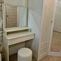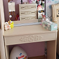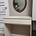 Туалетный столик ТС-15 - неотъемлемая часть спальни или женской комнаты. Каждая девочка, девушка или дама хочет иметь собственное пространство, свой уголок красоты, для того чтобы привести себя в порядок, нанести макияж, удобно и компактно расставить свою косметику и парфюмерию, аккуратно сложить украшения и аксессуары. Столик имеет один выдвижной ящик на телескопических направляющих без доводчиков. В оформлении фасадов МДФ применяется уникальная технология нанесения объемного узора 3D.