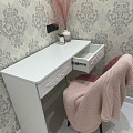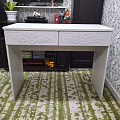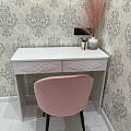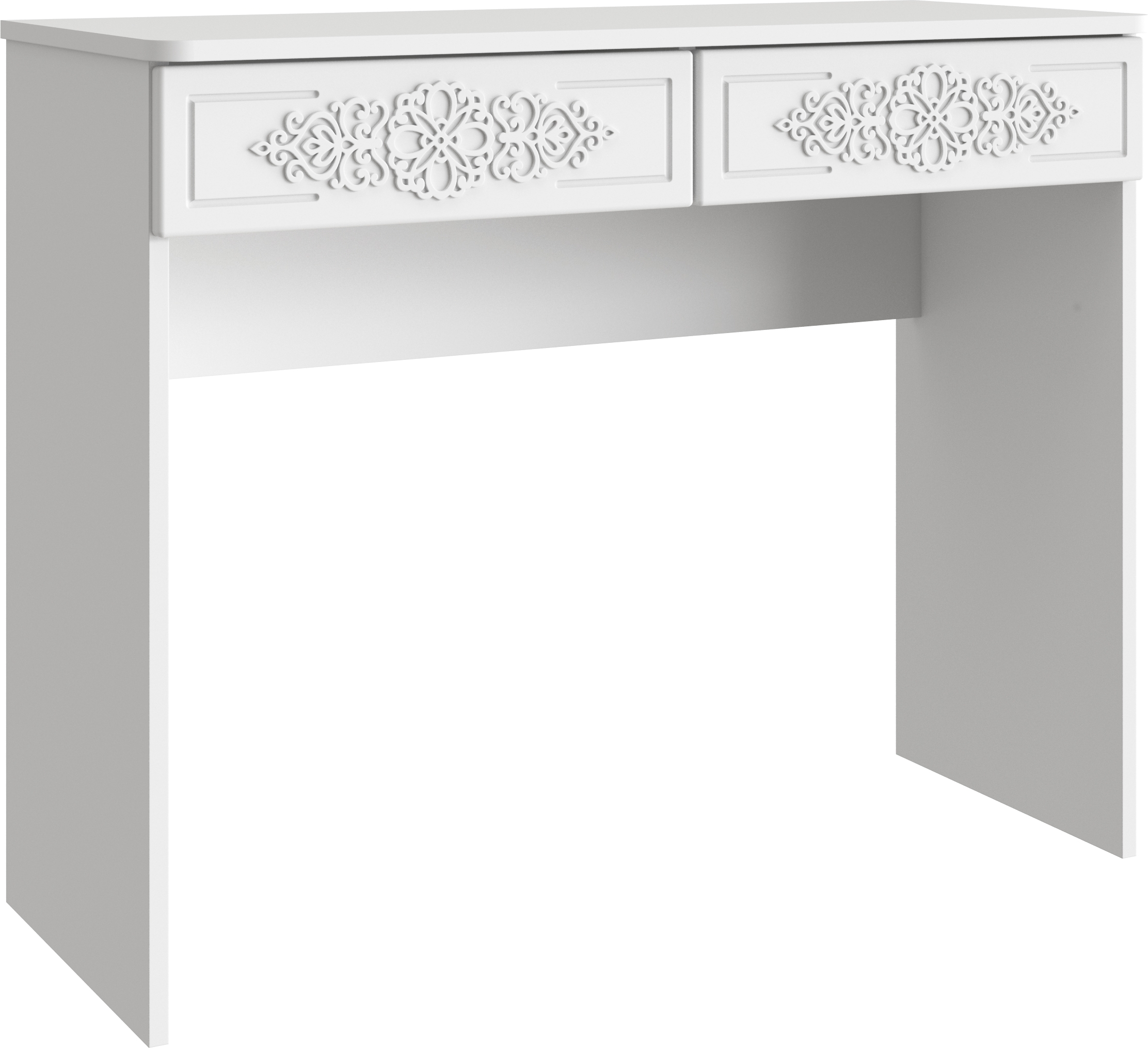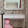 Туалетный столик ТС-25 - неотъемлемая часть спальни или женской комнаты. Каждая девочка, девушка или дама хочет иметь собственное пространство, свой уголок красоты, для того чтобы привести себя в порядок, нанести макияж, удобно и компактно расставить свою косметику и парфюмерию, аккуратно сложить украшения и аксессуары. Столик имеет два выдвижных ящика на телескопических направляющих без доводчиков. В оформлении фасадов МДФ применяется уникальная технология нанесения объемного узора 3D. Фурнитура: телескопические направляющие полного выдвижения.